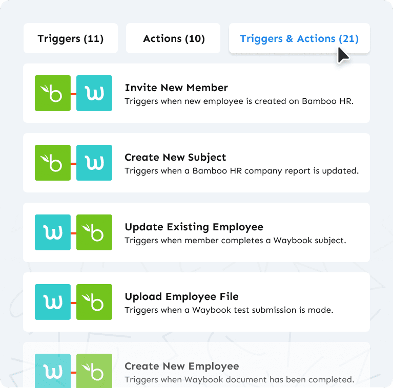 Book DemoUtilize Zapier to support a variety of other automated actions between BambooHR and Waybook, tailoring the integration to your unique business needs.